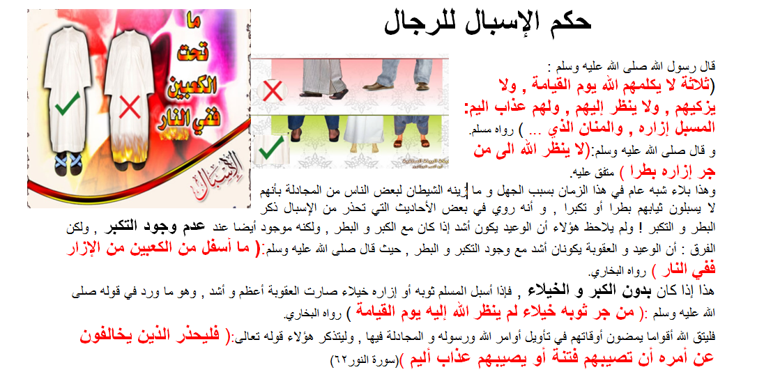 وهذا بلاء شبه عام في هذا الزمان بسبب الجهل و ما زينه الشيطان لبعض الناس من المجادلة بأنهم لا يسبلون ثيابهم بطرا أو تكبرا , و أنه روي في بعض الأحاديث التي تحذر من الإسبال ذكر البطر و التكبر ! ولم يلاحظ هؤلاء أن الوعيد يكون أشد إذا كان مع الكبر و البطر , ولكنه موجود أيضا عند عدم وجود التكبر , ولكن الفرق : أن الوعيد و العقوبة يكونان أشد مع وجود التكبر و البطر , حيث قال صلى الله عليه وسلم:( ما أسفل من الكعبين من الإزار ففي النار ) رواه البخاري.