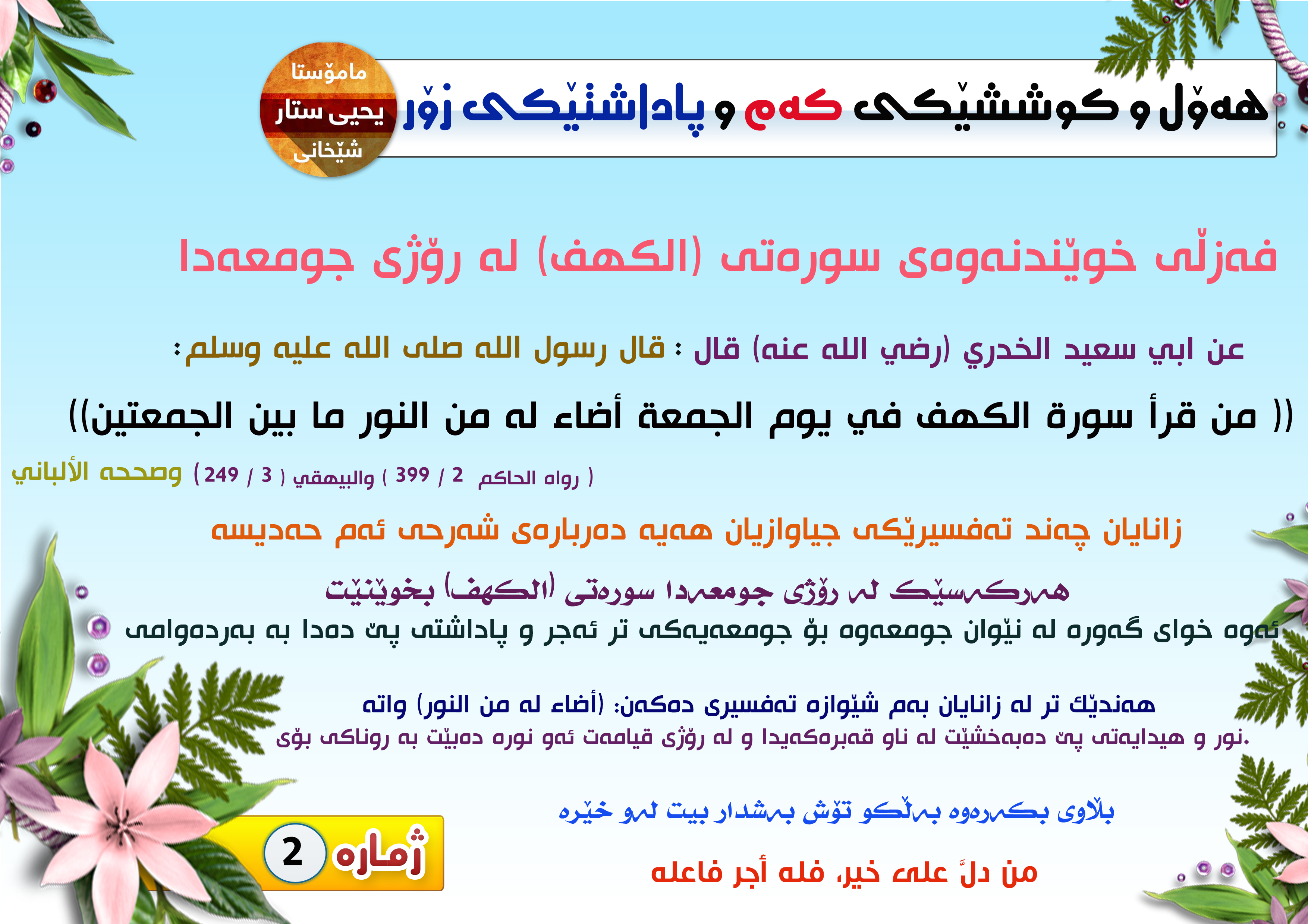 فەزڵی خوێندنەوەی سورەتی (الكهف) لە رۆژی جومعەدابەروار:٢٠١٥/٠٨/١١
