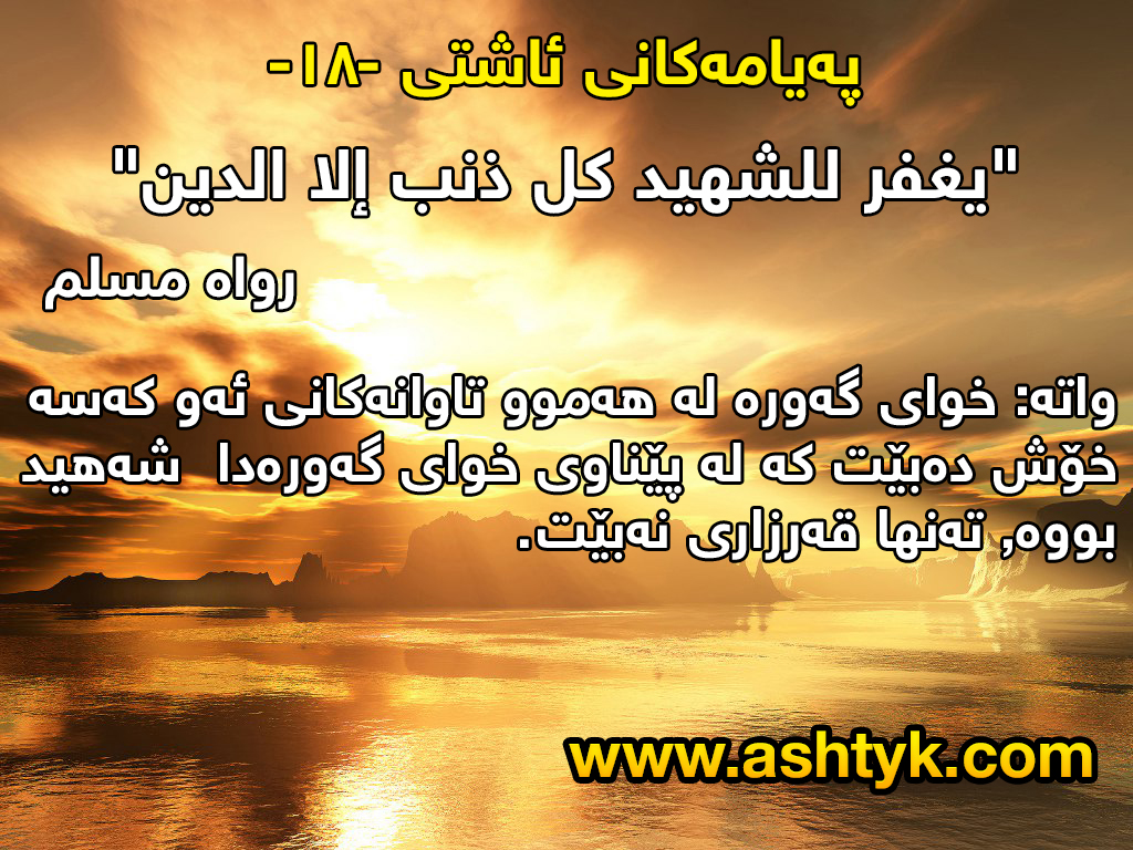 پێغەمبەری خوا (صلى الله عليه وسلم) دەفەرموێت: "يُغْفَرُ لِلشَّهِيدِ كُلُّ ذَنْبٍ إِلَّا الدَّيْنَ." رواه مسلم بەروار:٢٠١٤/٠٦/١٥