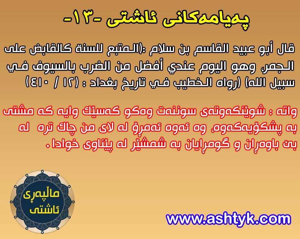 واتە : شوێنكەوتەی سوننەت وەكو كەسێك وایە كە مشتی گرتبێت بە پشكۆیەكەوە، وە ئەوە ئەمڕۆ لە لای من چاك ترە لە لێدانی بێباوەڕان و گومڕایان بە شمشێر لە پێناوی خوادا .
