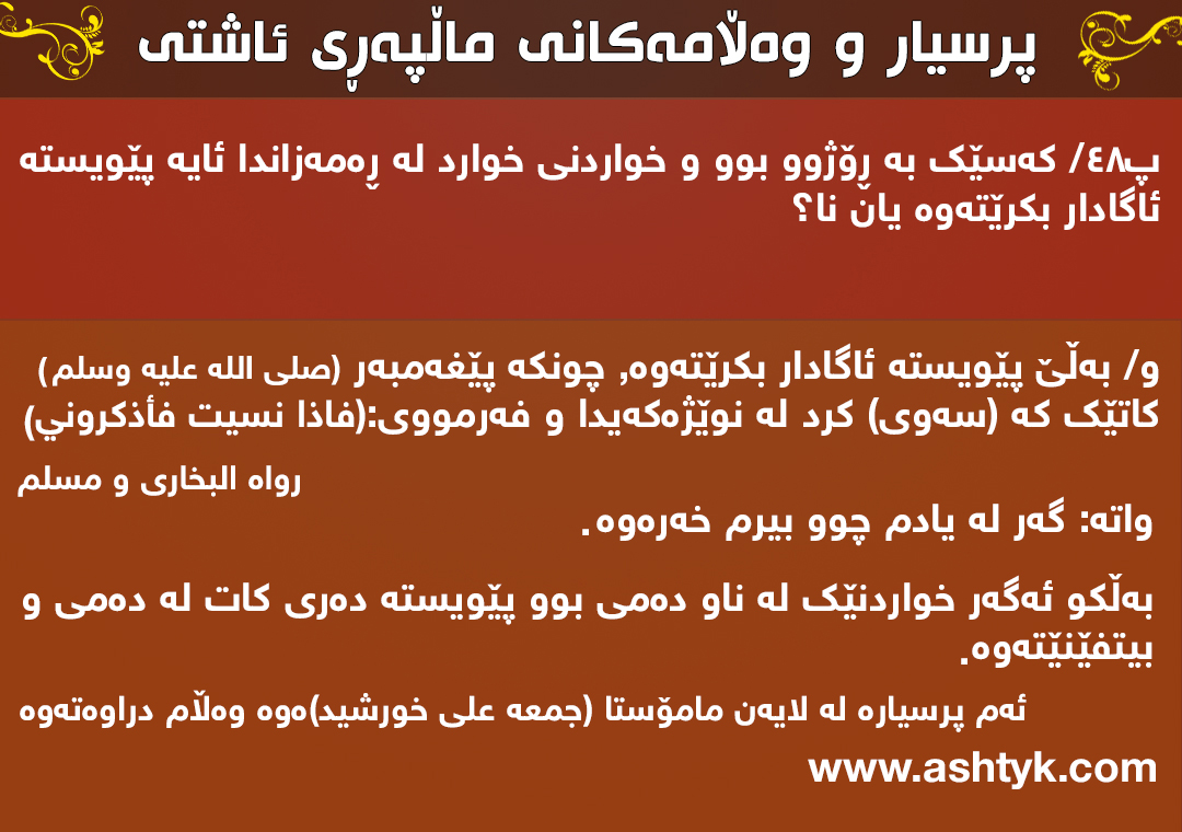 پ.ژ(٤٨):كەسێك بە ڕۆژوو بوو و خواردنی خوارد لە ڕەمەزاندا ئایە پێویستە ئاگادار بكرێتەوە یان نەء ؟