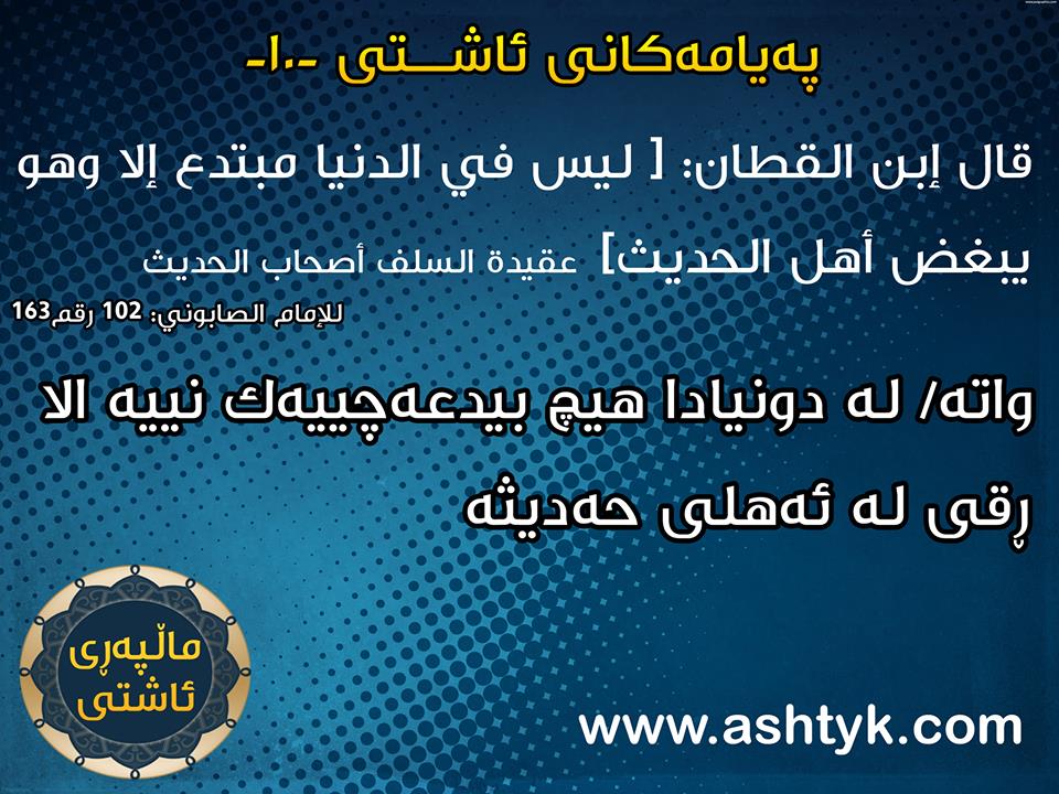 قال إبن القطان: [ ليسَ في الدنيا مُبْتدِعٌ إلا وهو يُبْغِضُ أهْلَ الحديثِ]( ( عقيدة السلف أصحاب الحديث) للإمام الصابوني: (102 رقم163).بەروار:٢٠١٤/٠٤/٢٦