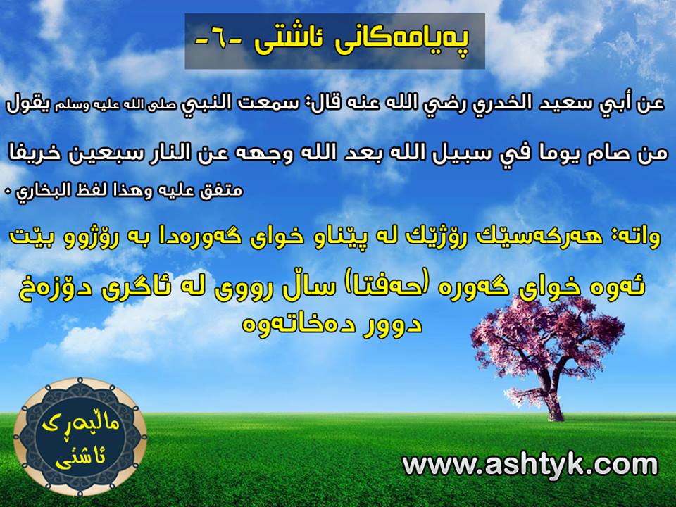 واتە: هەركەسێك رۆژێك لە پێناو خوای گەورەدا بە رۆژوو بێت ئەوە خوای گەورە (حەفتا) ساڵ رووی لە ئاگری دۆزەخ