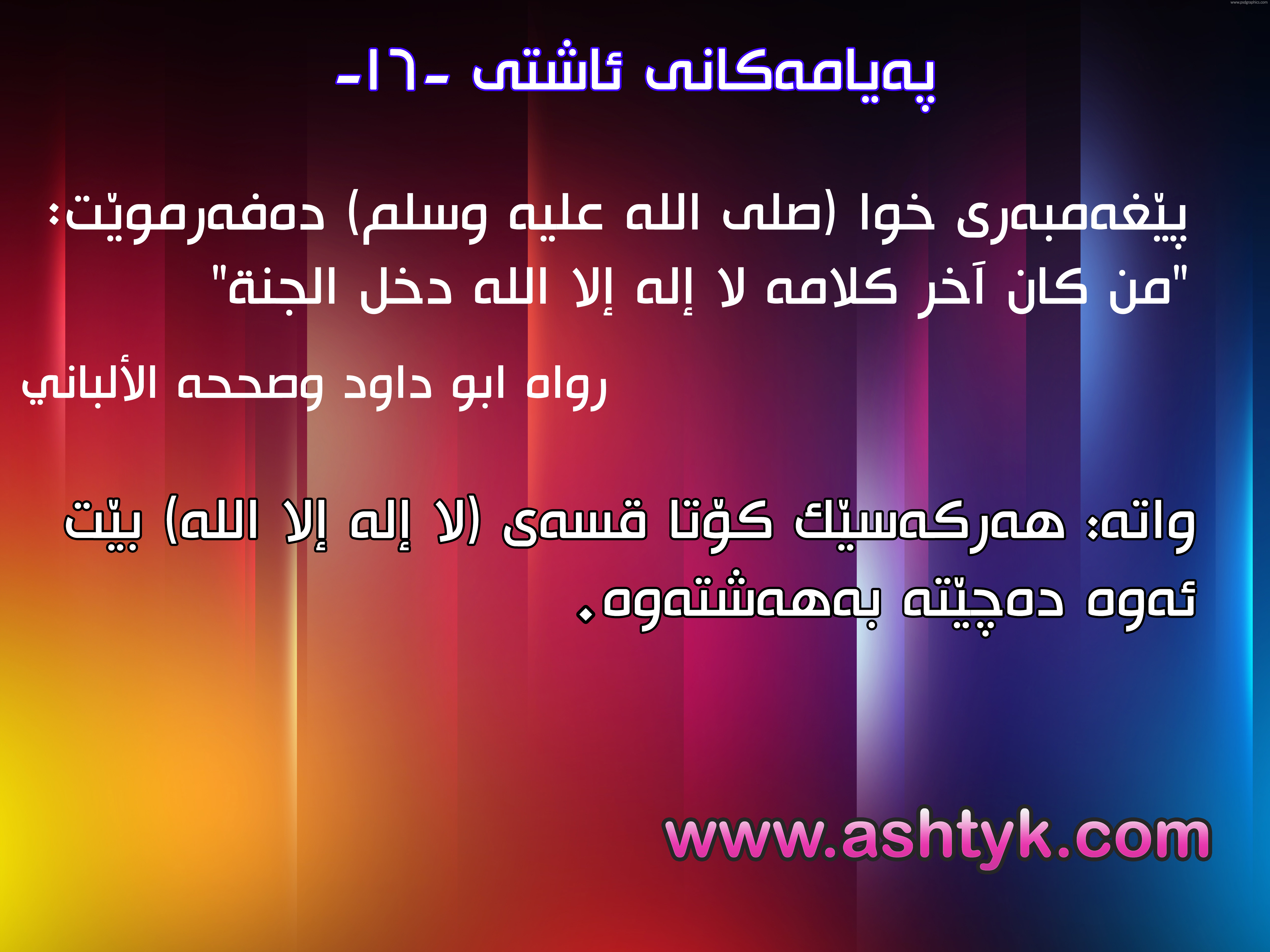 پێغەمبەری خوا (صلى الله عليه وسلم ) دەفەرموێت: "مَنْ كَانَ آخِرُ كَلَامِهِ لَا إِلَهَ إِلَّا اللَّهُ دَخَلَ الْجَنَّةَ." رواه ابو داود وصححه الألباني . بەروار:٢٠١٤/٠٦/١٥