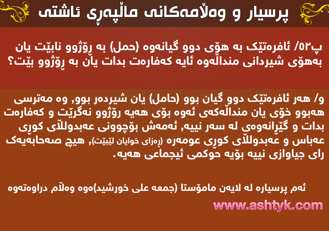 پ.ژ(٥٢):ئافرەتێك بە هۆی دوو گیانەوە (حمل) بە ڕۆژوو نابێت یان بە هۆی شیردانی منداڵەوە ئایە كەفارەت بدات یان بە ڕۆژوو بێت ؟