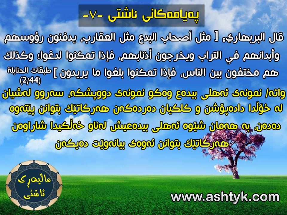 واتە/ نمونەی ئەهلی بیدەع وەكو نمونەی دووپشكە، سەروو لەشیان لە خۆڵدا دادەپۆشن و كلكیان دەردەكەن، هەركاتێك بتوانن پێتەوە دەدەن، بە هەمان شێوە ئەهلی بیدەعیش لەناو خەڵكیدا شاراوەن، هەركاتێك بتوانن ئەوەی بیانەوێت دەیكەن.